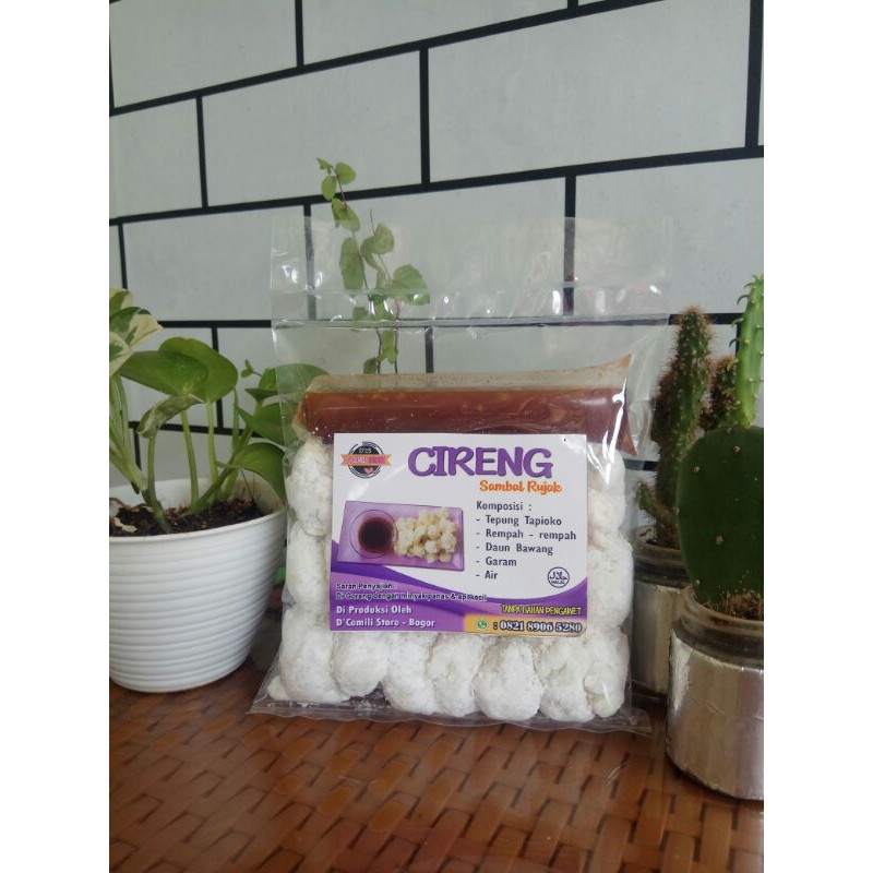 Rujak Cireng adalah cireng siap goreng disertai dengan bumbu rujak spesial yang mantap dengan bumbu bahan alami gula merah, asam Jawa, cabe, garam, dan bawang putih . Bumbu Tidak menggunakan bahan pengental seperti maizena. Asam nya pun alami tidak menggunakan cuka. dan menggunakan gula Jawa sehingga ketika di freezer tidak mudah membeku. 1pack rujak Cireng berisi 20pcs.