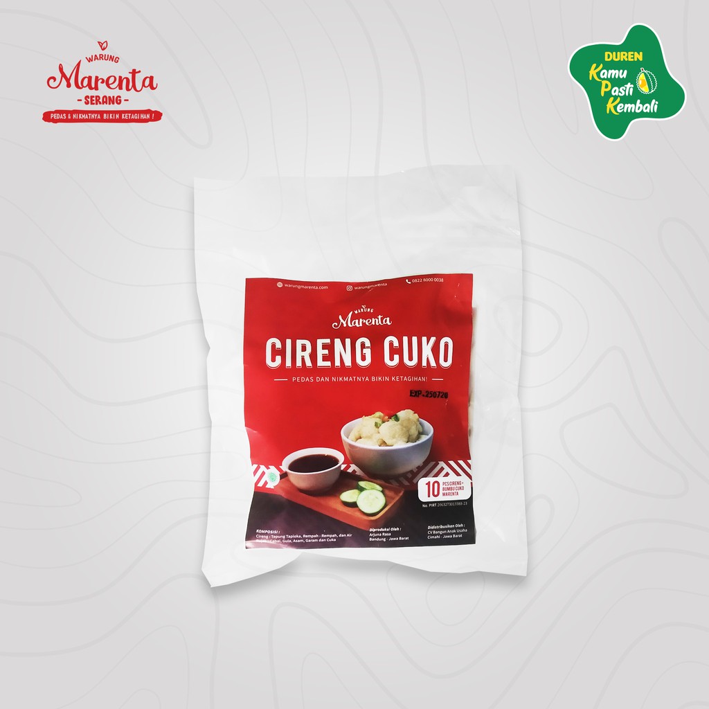Cireng yang dipadukan dengan kuah cuko lezat, asli, dan alami dari Marenta. Didistribusikan oleh Duren KPK. Tekstur cireng yang empuk dan tidak keras sehingga enak di mulut.