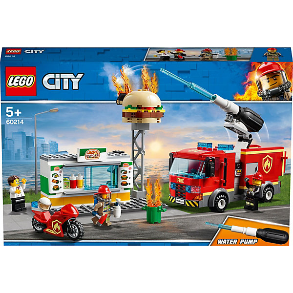 Спаси гамбургеры! В закусочной города LEGO® City загорелась вывеска, и владельцу нужна твоя помощь. Пристегни свой кислородный баллон, запрыгивай в пожарную машину и направляйся к месту пожара, пока твоя напарница по пожарной службе спешит туда на своём мотоцикле. Когда приедешь, направь шланг от насоса на огонь и начинай тушить пожар. Сможешь ли ты сделать это, прежде чем закусочная сгорит до тла? И не забудь потушить горящий мусорный бак!