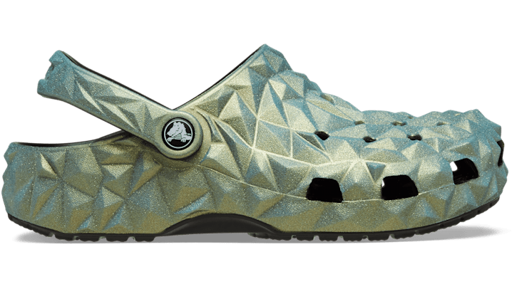 A geometric molded design with iridescent finish provides extra style to this version of the iconic clog. The unique design and finish helps you show off your creative spirit, and Croslite™ foam construction keeps them light and easy to wear. Grounded in comfort, spiked with personality. Classic Iridescent Geometric Clog Details: • Geometric molded texture • Iridescent finish • Incredibly light and fun to wear • Ventilation ports add breathability and help shed water and debris • Easy to clean and quick to dry • Pivoting heel straps for a more secure fit • Customizable with Jibbitz™ charms • Iconic Crocs Comfort™: Lightweight. Flexible. 360-degree comfort.