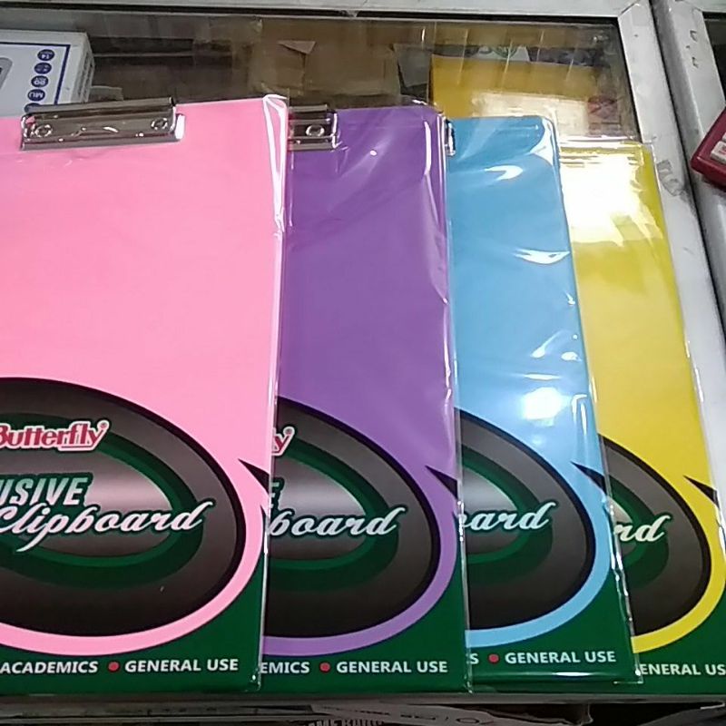 Clipboard Butterfly Doff. Ukuran Folio. Tersedia 4 warna (Pink, Ungu, Biru & Kuning). Apabila warna yang dipilih tidak ada, maka kami kirimkan warna random. Terima kasih