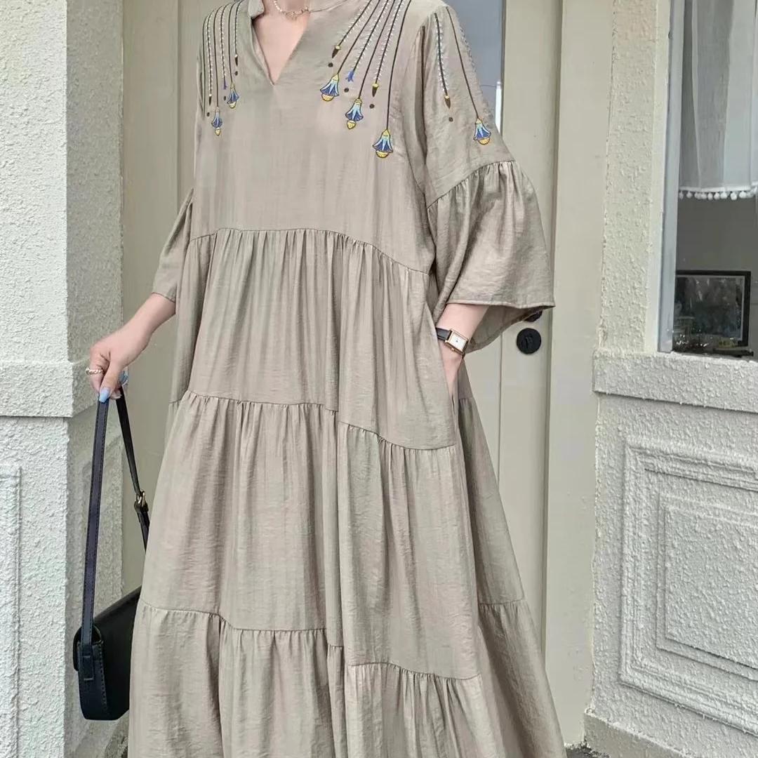 Clothland Женское Элегантное Вышитое Платье V-образный Вырез Расклешенные Рукава Свободный Стиль Цельный Ретро Миди Платья One Size хаки