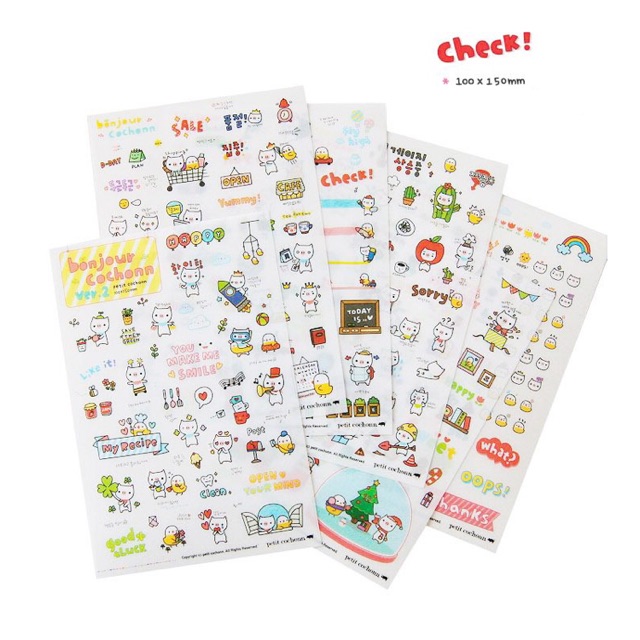 Stiker dekorasi (deco sticker) bertema karakter Cochonn yang imut dan lucu, ditemani oleh temannya si anak ayam kuning yang tidak kalah imutnya.