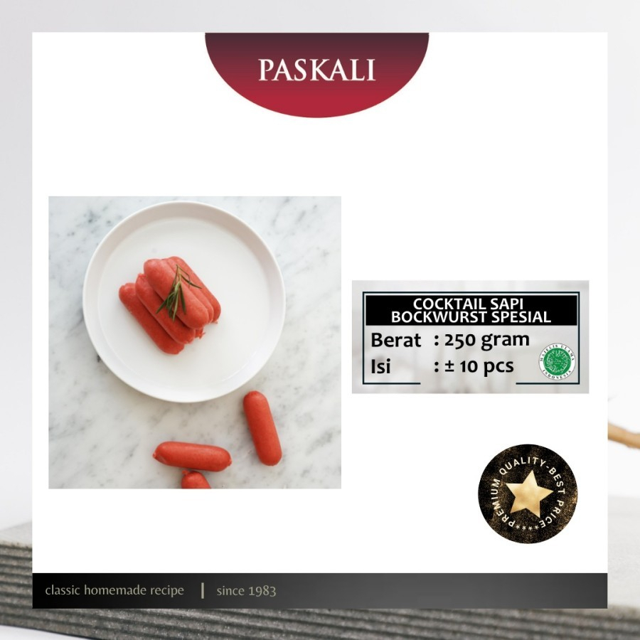Cocktail Sapi Bockwurst Premium Paskalii merupakan salah satu bahan olahan yang praktis dan digemari di kalangan anak-anak sampai dewasa sebagai makanan yang bergizi tinggi. Produk Paskali komposisi dagingnya lebih banyak dari produk lain. Ukuran Cocktail Sapi Paskali cocok untuk dikonsumsi anak-anak.