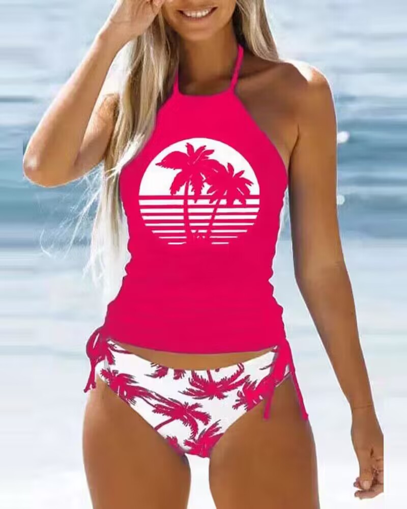 Coconut Tree Print Drawstring Ruched Halter Tankini Set, Rose red