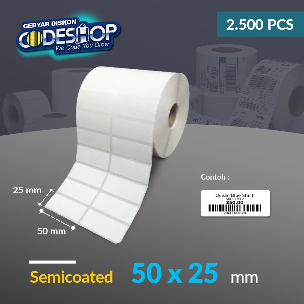 Codeshop Label Semicoated 50 x 25 mm 2 Line Stiker Printer Barcode Core 1 Inch isi 2500 Pcs