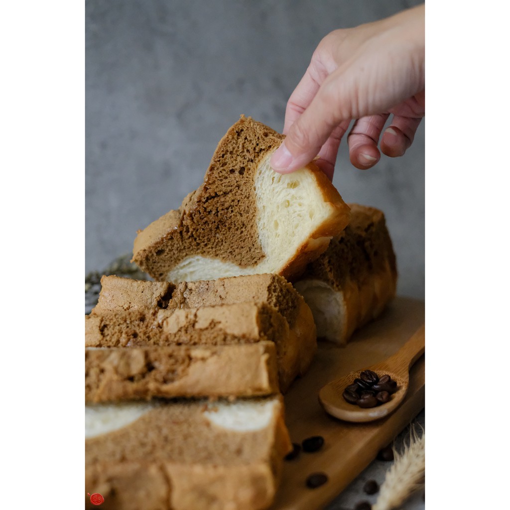 Hasil gabungan dari Coffee Castella Cake di bagian atas dan Roti susu premium di bawahnya.