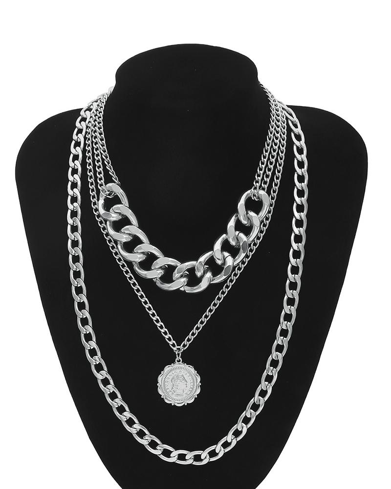 Coin Figure Pattern Layered Chain Necklace, Silver