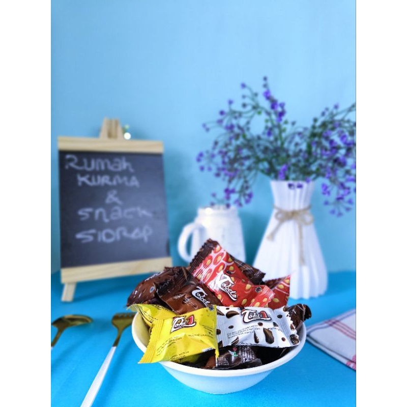 Coklat Tobelo Choco Party adalah varian coklat dari Tobelo Chocolate yang sangat cocok untuk kamu yang suka camilan ringan dan manis. Setiap bag berisi 40 pc coklat rice crispy dengan isian krim beraneka rasa seperti Coklat Original, Pisang, Mangga, Strawberry, dan Greentea.