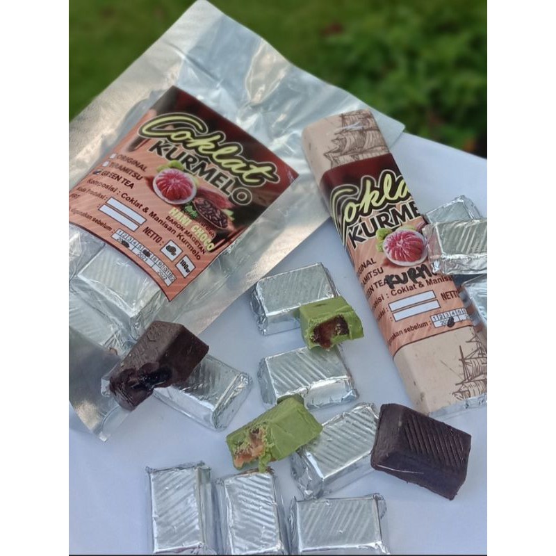 Coklat Bar Curmelo dengan varian rasa Ori dan Green Tea dengan isian manisan kulit jeruk pamelo.