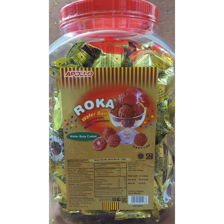 Apollo Coklat Roka Toples isi 70pcs @6gr, expired Maret 2026. Berat barang dihitung volume karena bulky.