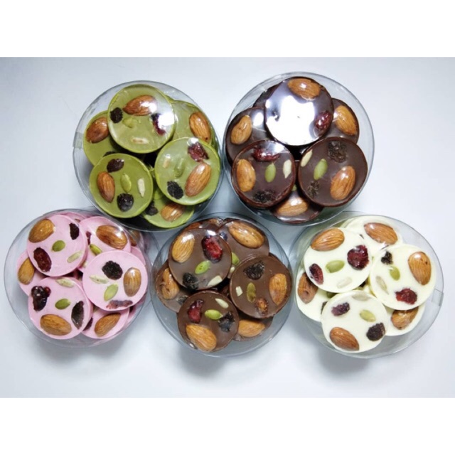 Terbuat dari coklat berkualitas PREMIUM made in Indonesia ditaburi kacang Almond utuh, pumkin seed, sunflower seed, cranberry dan kismis yg semua bahannya dijamin sehat dan nikmat. Bisa cek sendiri rasa coklat yg enak ga nempel di langit2 mulut, serta taburan topping yg mewah dengan harga yg sesuai rasa harganya: