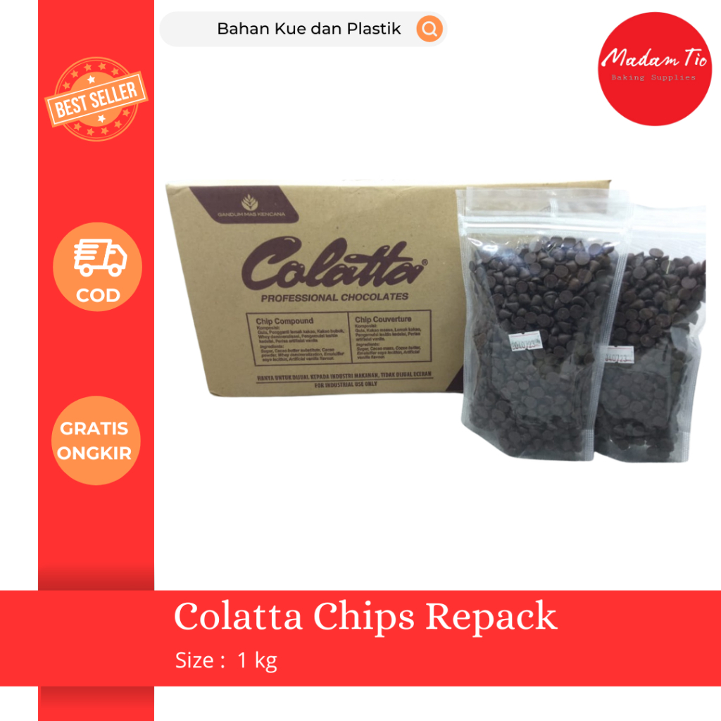 Colatta Chips 1kg Repack adalah cokelat compound berbentuk chip atau tetes kecil yang ideal untuk berbagai kebutuhan pembuatan kue, dessert, dan camilan. Dikemas ulang dalam kemasan 1 kg untuk memenuhi kebutuhan konsumen rumahan maupun usaha kecil menengah. Berikut detailnya: