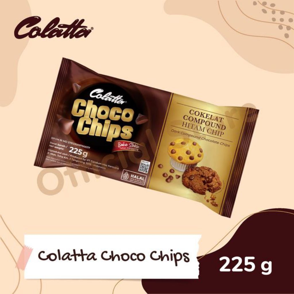 Colatta Choco Chips 225g dengan rasa Dark Chocolate yang intens dan memiliki warna Reddish, Bake Stable, dan banyak digunakan sebagai isian cup cake, muffin, beragam pastry, cookies