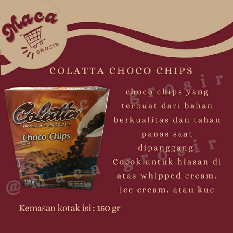 Colatta Choco Chips adalah cokelat berbentuk butiran kecil yang terbuat dari gula, lemak nabati, susu bubuk, pengemulsi lesitin kedelai, dan perisa vanila. Colatta Choco Chips bisa digunakan sebagai topping atau campuran adonan