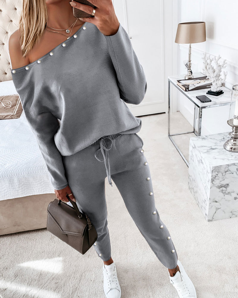 Cold Shoulder Beaded Top & Drawstring Pants Set, Gray