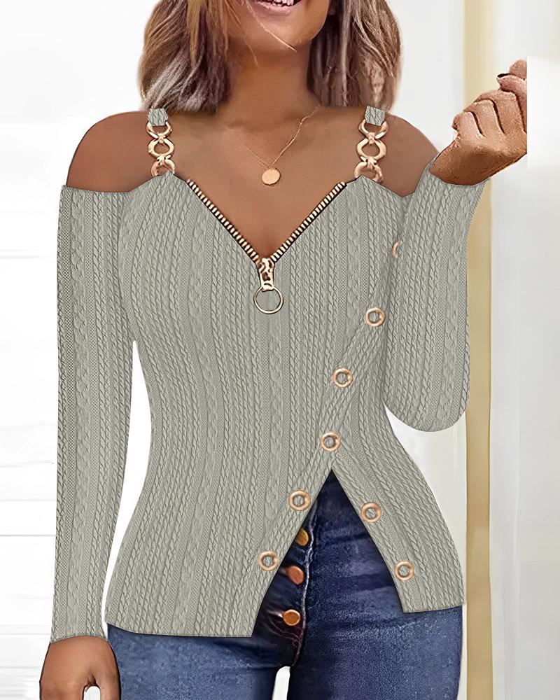 Cold Shoulder Chain Decor Slit Cable Textured Top, Gray