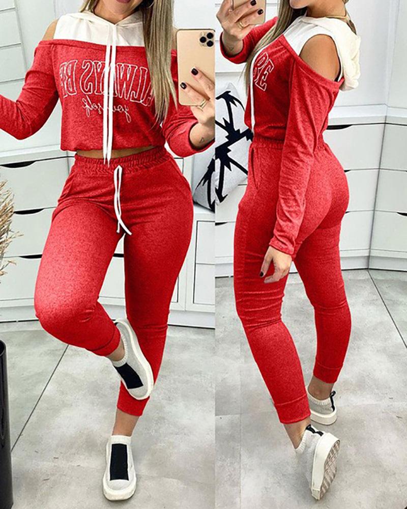 Cold Shoulder Colorblock Letter Print Hooded Top & Drawstring Pants Set, Red