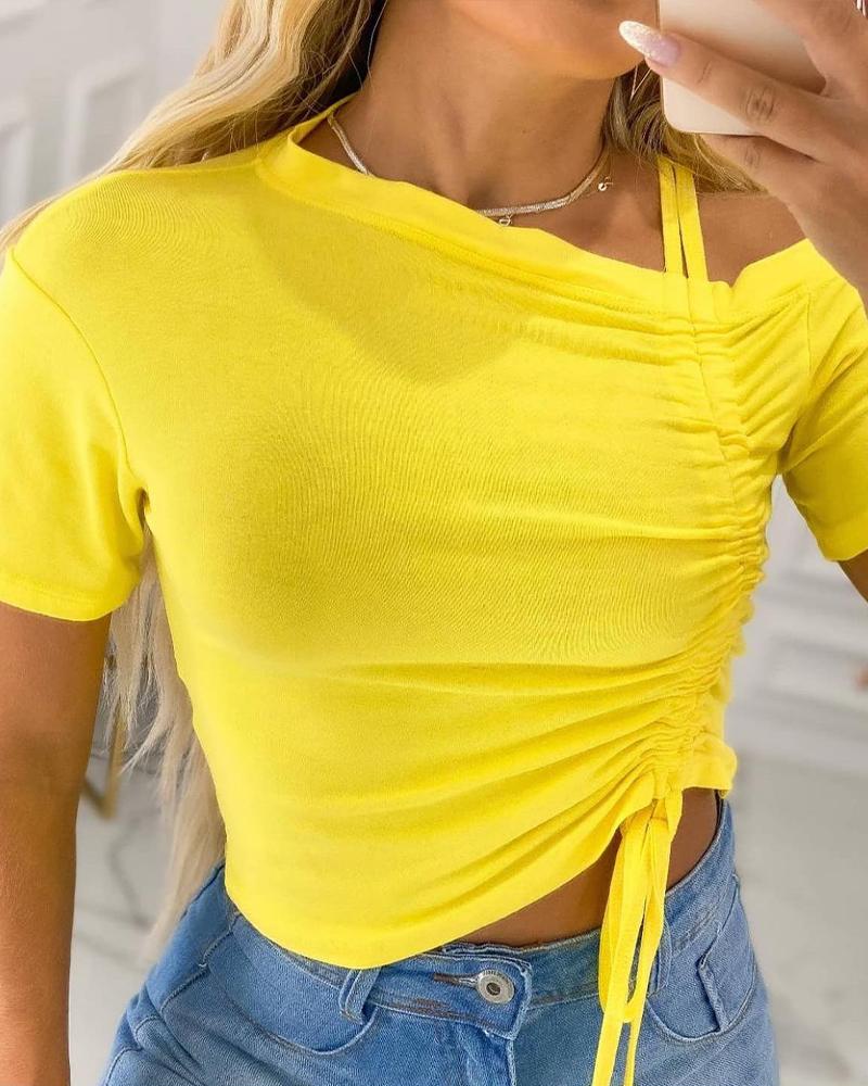 Cold Shoulder Drawstring Ruched Ribbed Crop Top, Yellow