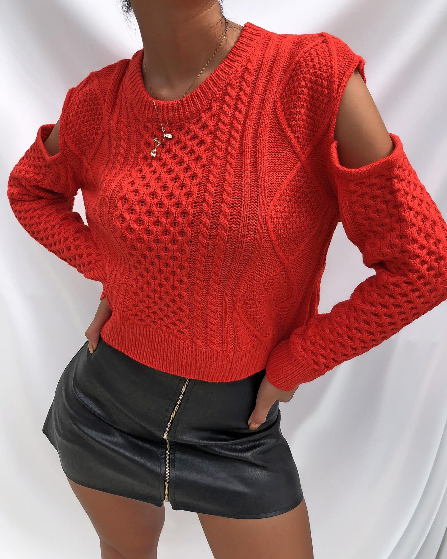 Cold Shoulder Long Sleeve Cable Knit Sweater, Red
