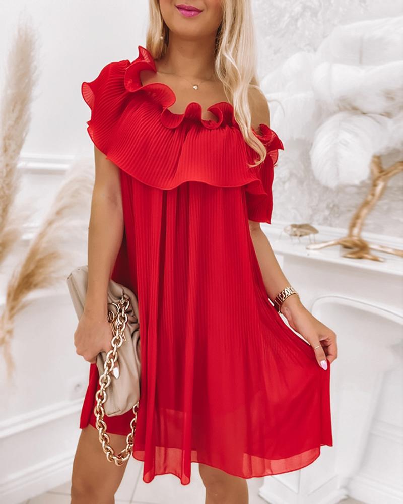 Cold Shoulder Ruched Ruffles Swing Dress, Red