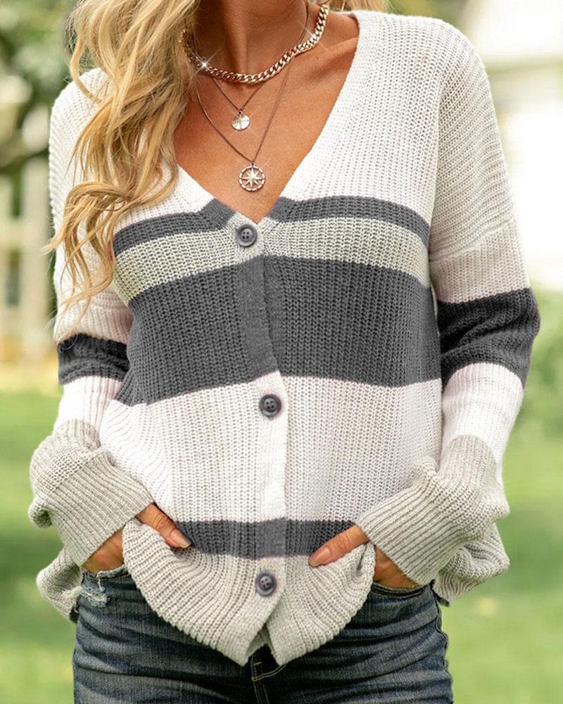 Color Block Striped Chunky Knit Buttoned Cardigan, Gray