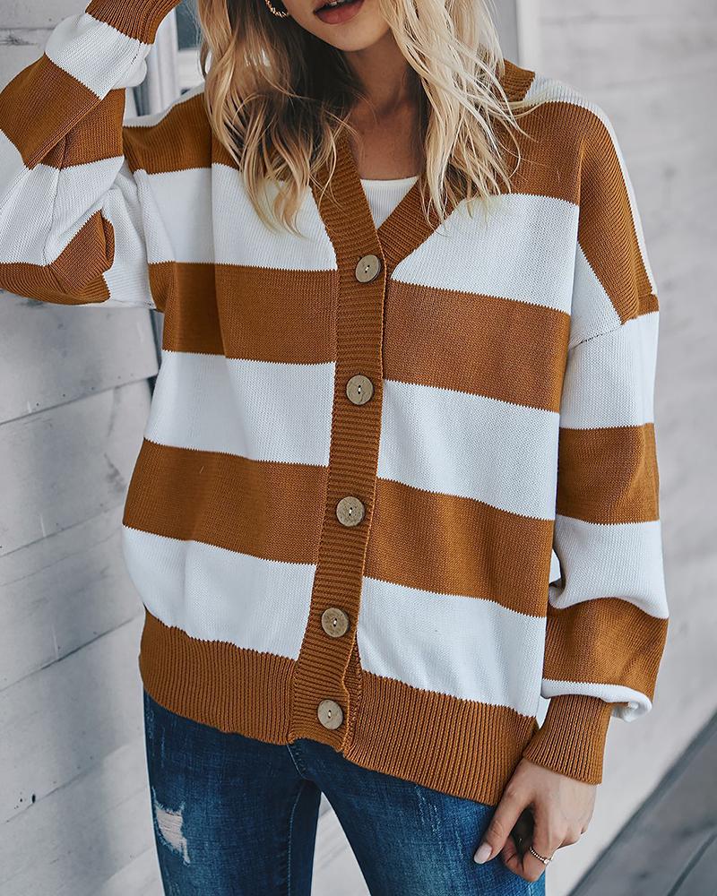 Colorblock Button Design Casual Top, Brown