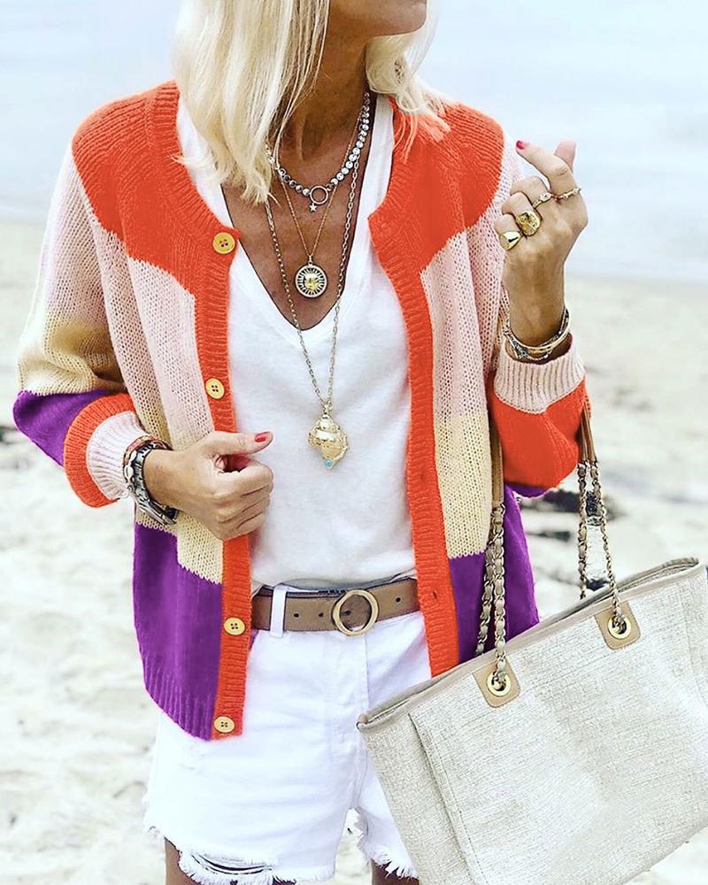 Colorblock Insert Buttoned Knitting Cardigan, Orange