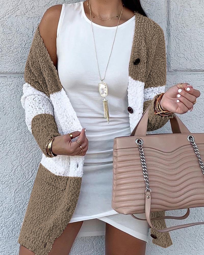 Colorblock Insert Open Front Buttoned Fluffy Cardigan, Khaki
