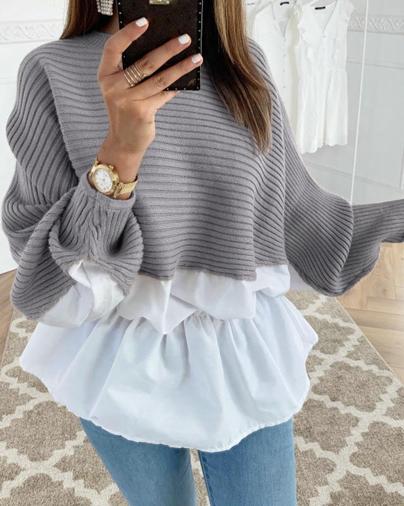 Colorblock Insert Ruffles Ribbed Batwing Sleeve Blouse, Gray