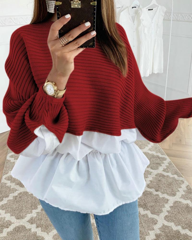 Colorblock Insert Ruffles Ribbed Batwing Sleeve Blouse, Red