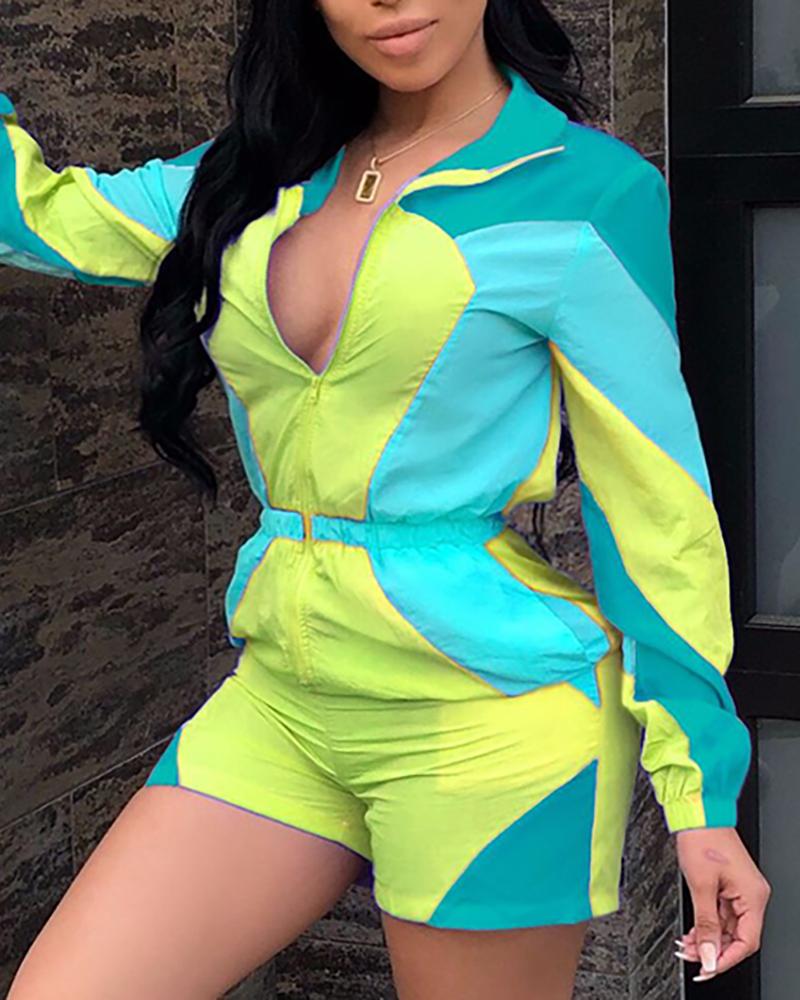 Colorblock Insert Zipper Design Romper, Green