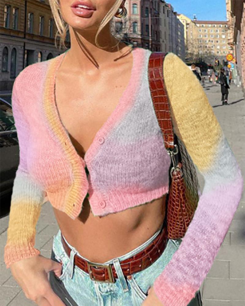 Colorblock Long Sleeve Button Design Knit Cardigan, Pink