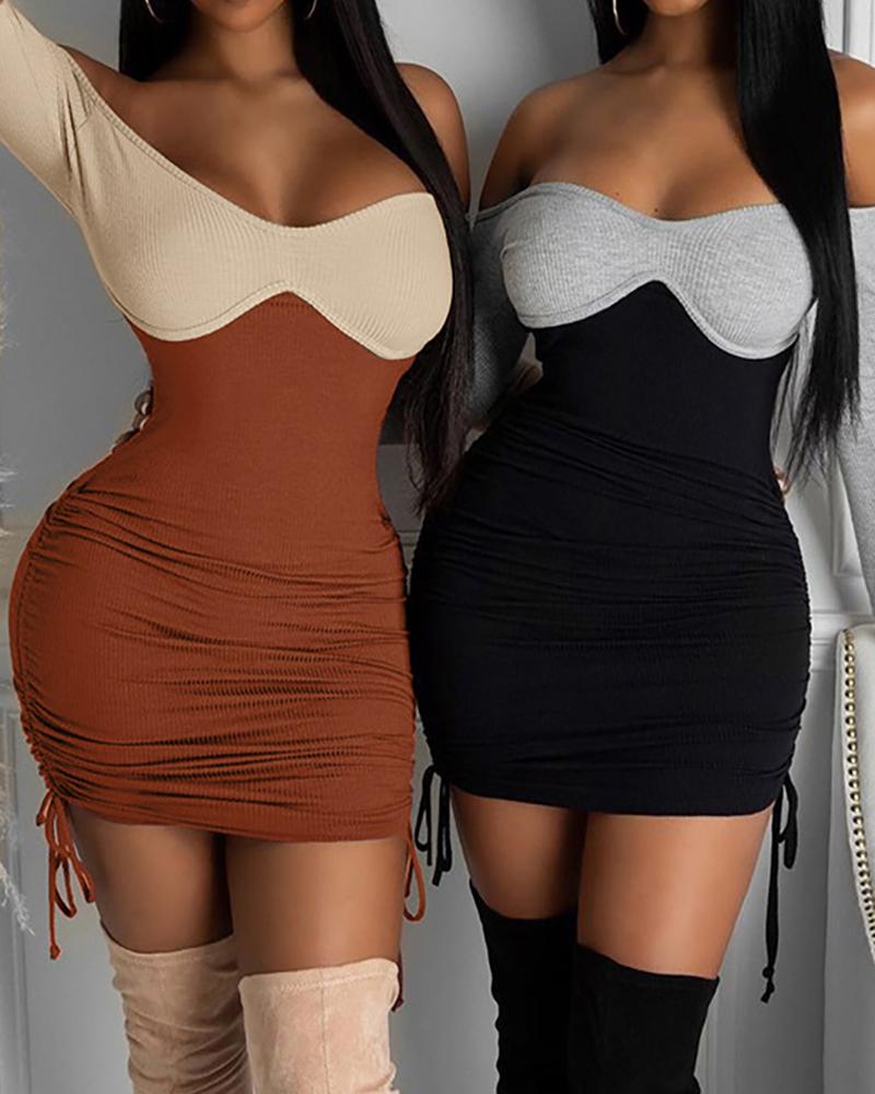 Colorblock Off Shoulder Drawstring Ruched Bodycon Dress, Brown