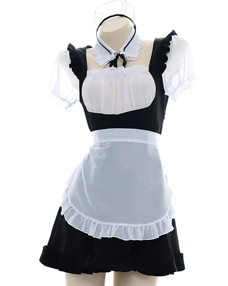 Colorblock Puff Sleeve Ruffle Hem Maid Costume, Black