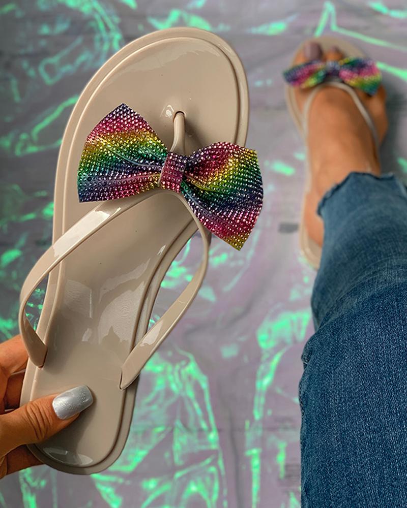 Colorblock Rhinestone Bowknot Flat Sandals, Apricot