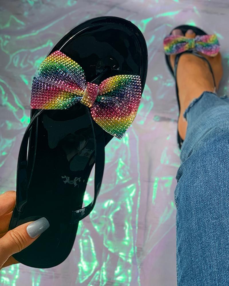 Colorblock Rhinestone Bowknot Flat Sandals, Black