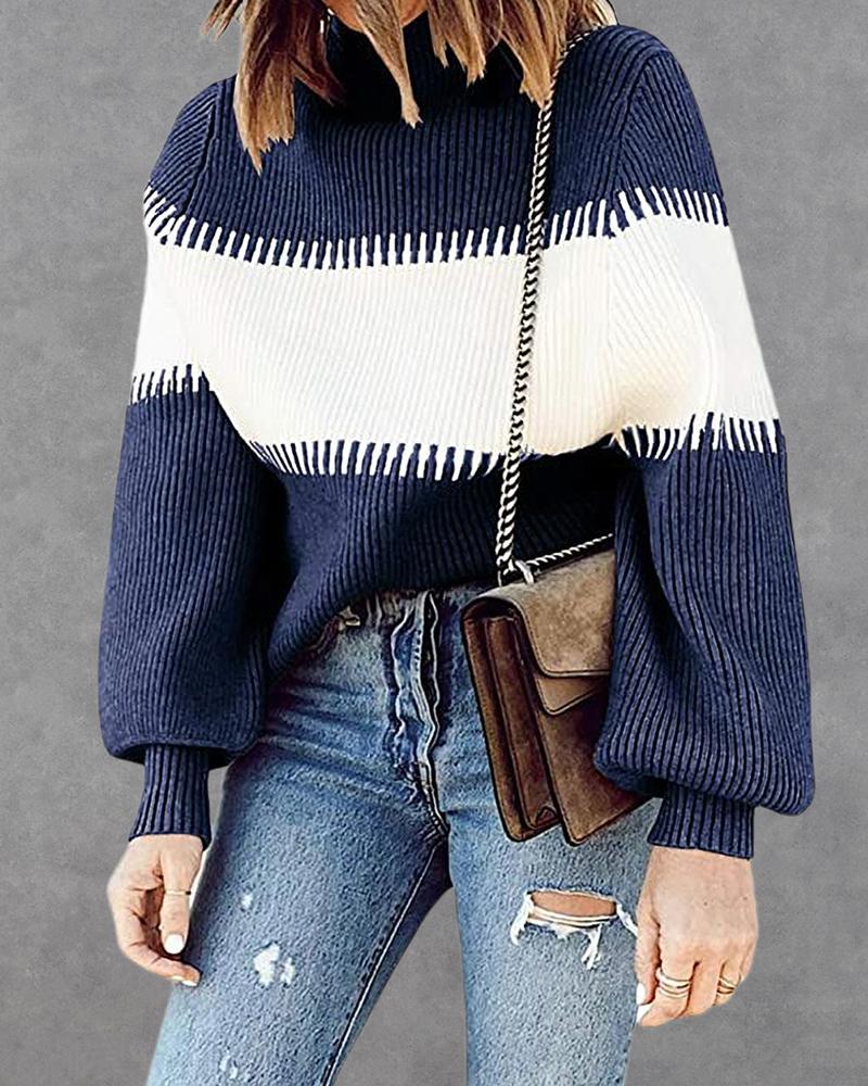 Colorblock Ribbed High Neck Sweater, Blue