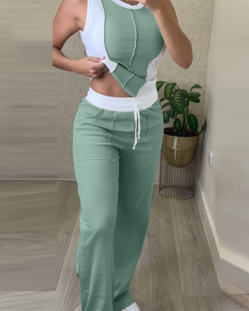 Colorblock Ribbed Tank Top & Pocket Design Pants Set, Green