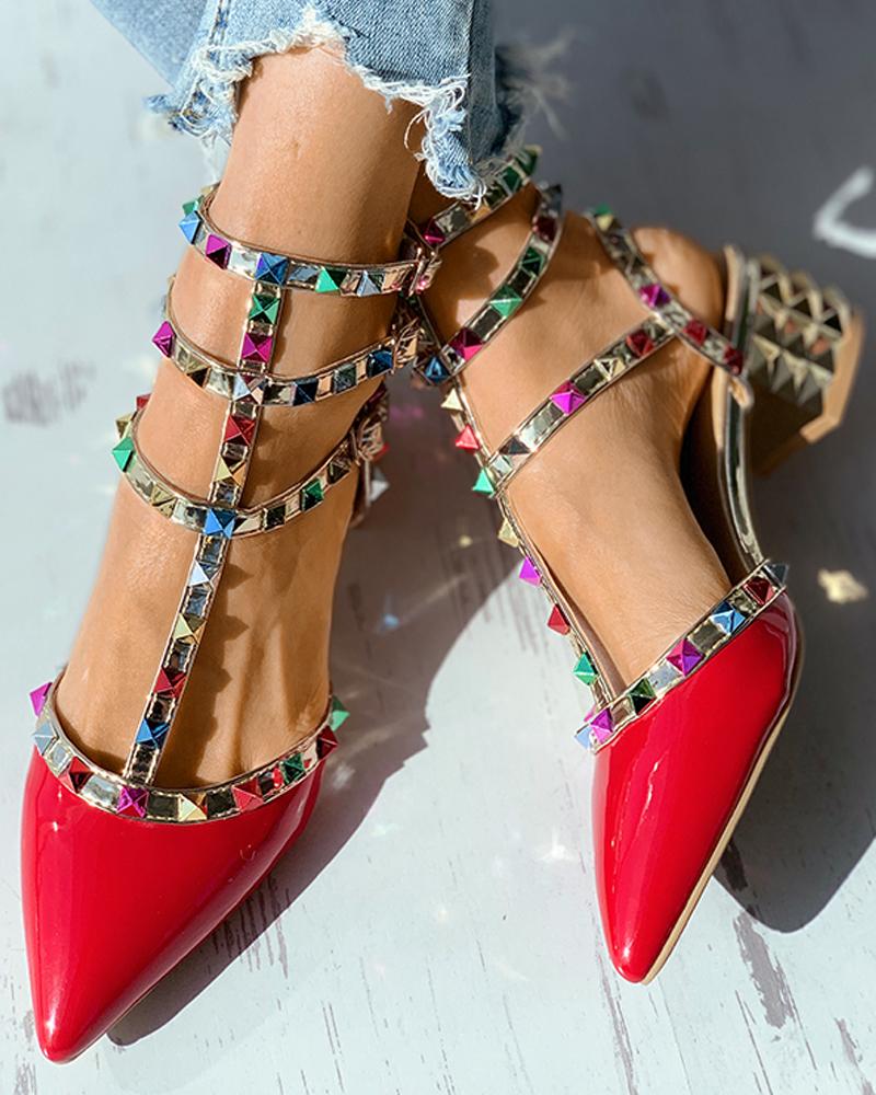 Colorblock Rivet Pointed Toe Chunky Heels, Red