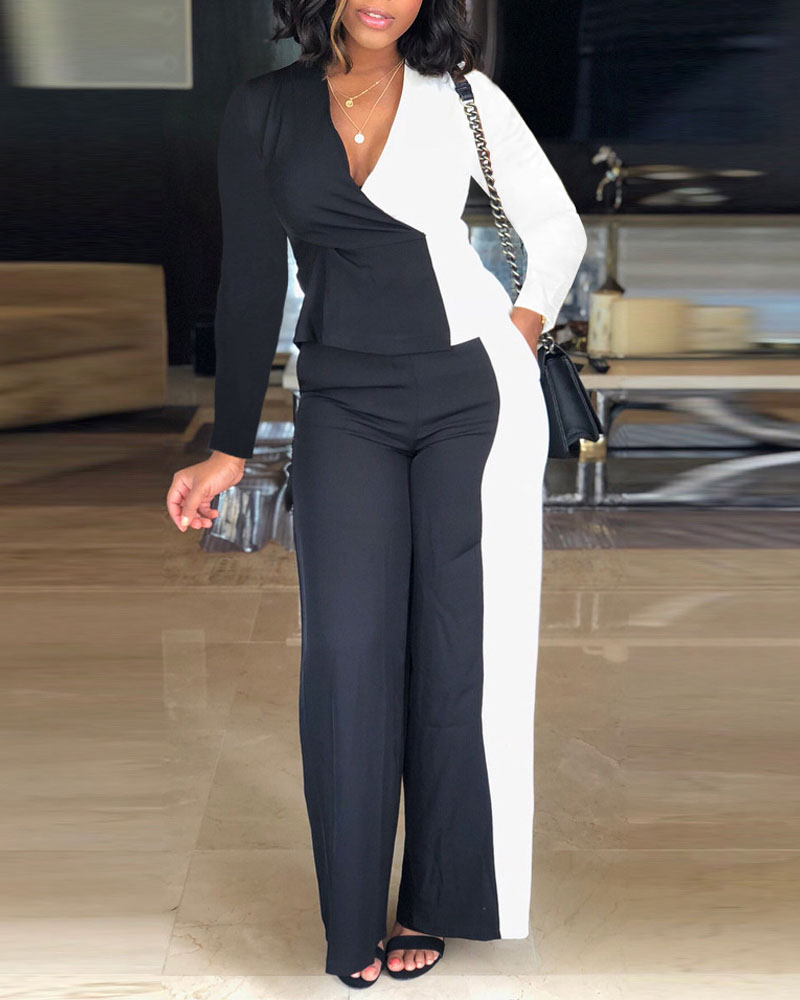 Colorblock Wrap Ruched Top & Straight Leg Pants Set, Black