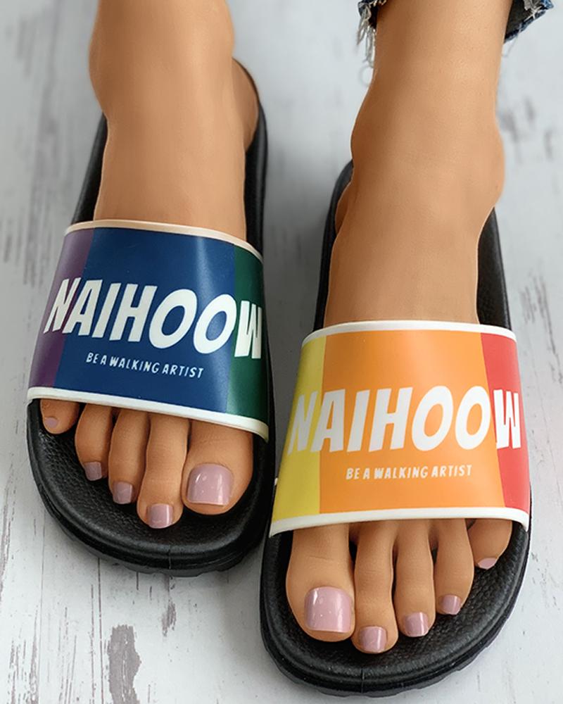Colorful Rainbow Letter Pattern Slider Sandals, Black