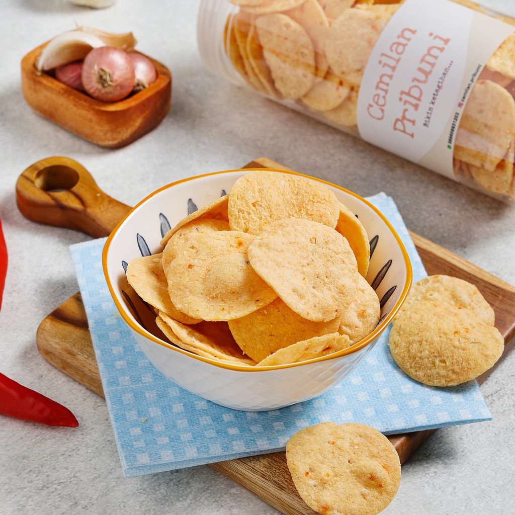 cemilan pribumi yang bernama COMBRING ini terbuat dari singkong pilihan dan rempah rempah yang khas rasa gurih renyah pas di mulut .