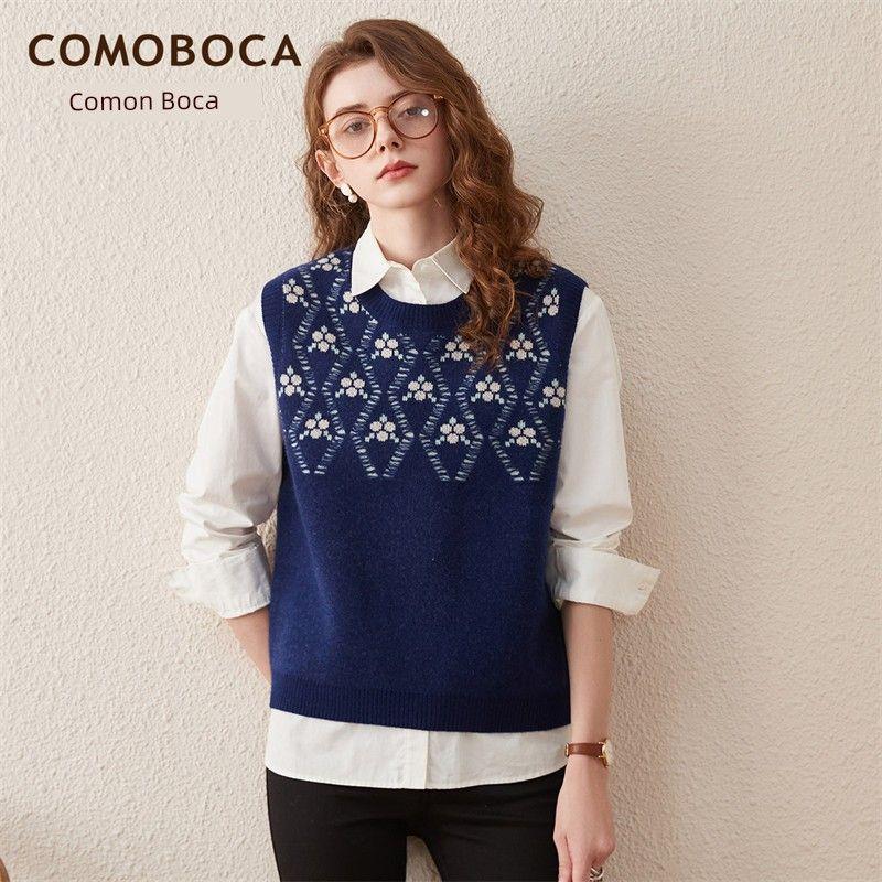 Comonboka 100% Шерсть Толстый Круглый Вырез Контрастный Цвет Клетка Модный Стиль Вязаный Осень и Зима Шерстяной Женский Жилет Hua Zang Qing 100/M