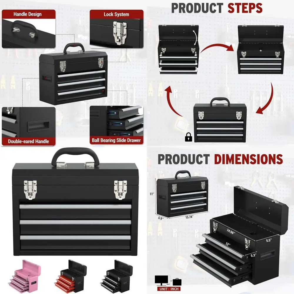 Compact 3-Drawer Steel Toolbox with Lockable System and Organizer for Portable Tool Storage in Black