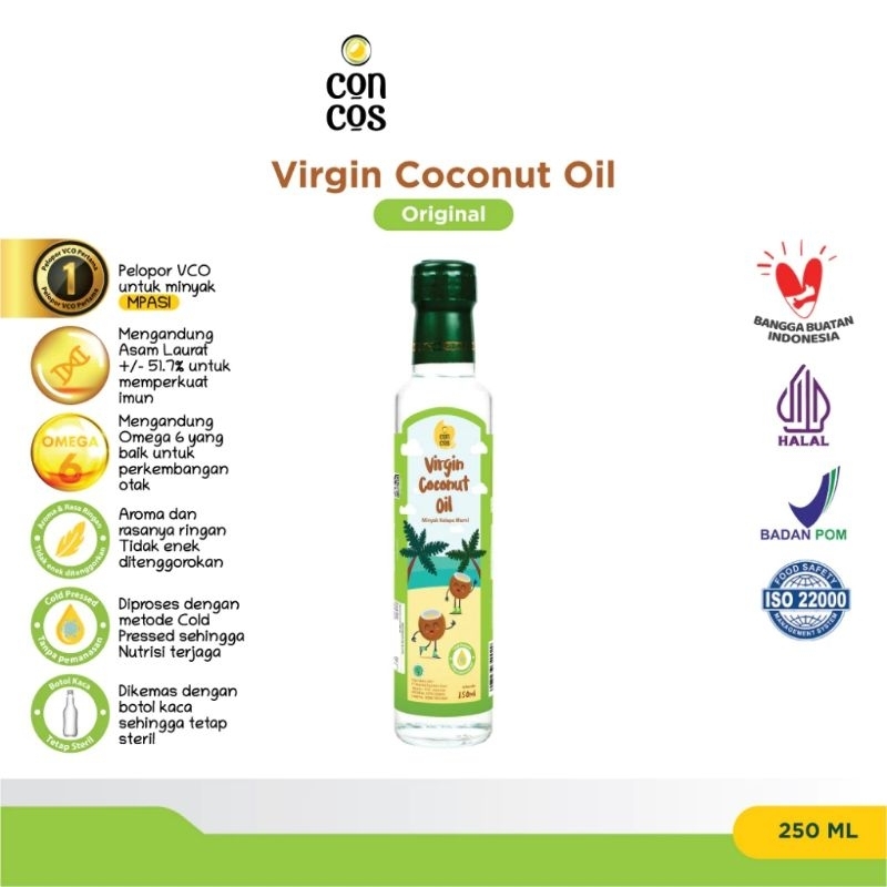 Concos Virgin Coconut Oil Kids 100ml (minyak kelapa murni 100%) merupakan minyak kelapa murni dengan kandungan utama asam laurat yang memiliki sifat antibiotik, anti bakteri dan jamur. Metode esktraksi consos adalah cold pressesed dan tanpa pemanasan ataupun tambahan kimia.