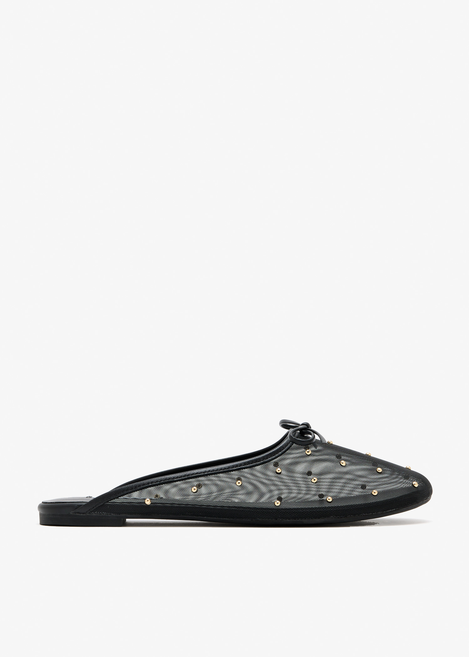 Playfully refined, these mesh slip-on ballet mules shimmer with gold-tone stud embellishments and a dainty bow for a touch of charm. Finished with a durable rubber sole, they balance lightness, comfort, and statement detail for effortless everyday styling.