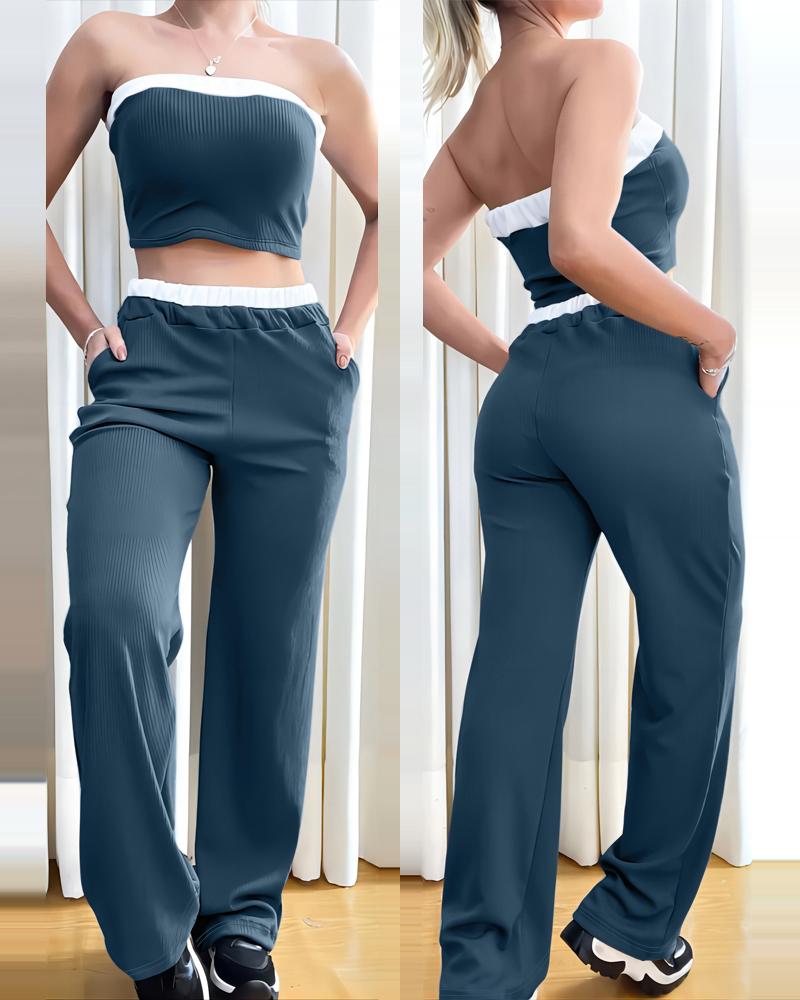 Contrast Binding Bandeau Ribbed Top & Pocket Design Pants Set, Dark grey