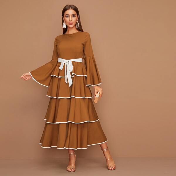 Contrast Binding Open Shoulder Tiered Flounce Dress, White, Andy