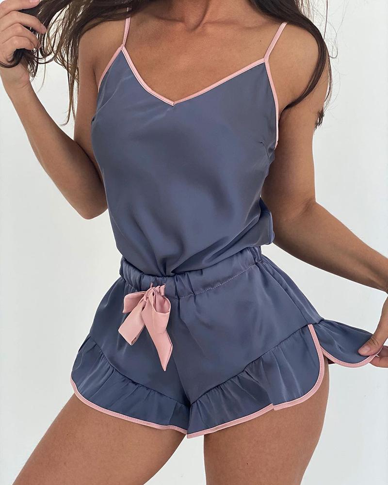 Contrast Binding Ruffle Hem Drawstring Cami Set, Blue